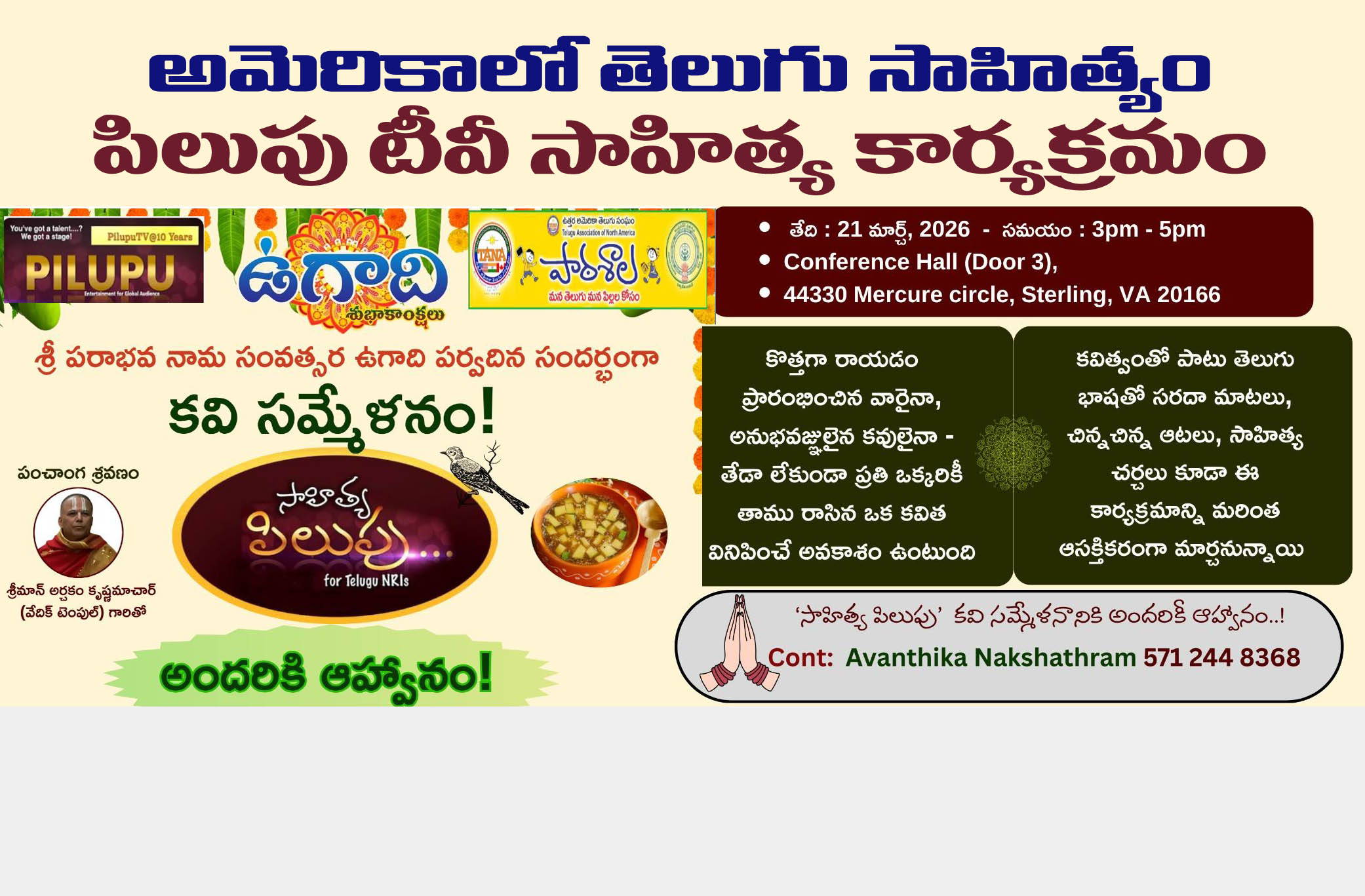 అమెరికాలో తెలుగు భాషను ప్రోత్సాహించేలా “పిలుపు టివీ” సాహిత్య కార్యక్రమాన్ని ఉగాది నుంచి ప్రారంభిస్తోంది. తానా పాఠశాల, ఆటా సాహిత్య బృందం, మన బడి, GWTCS, CATS...
