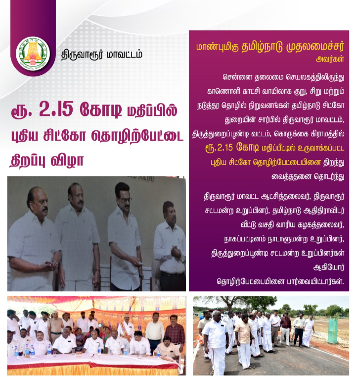 திருவாரூர் மாவட்டம் திருத்துறைப்பூண்டி வட்டம் கொருக்கையில் ரூ.2.15 கோடி மதிப்பில் முதலமைச்சர் அவர்கள் காணொளி காட்சி வாயிலாக புதிய சிட்கோ தொழிற்பேட்டையை திறந்து வைத்தார். அதை தொடர்ந்து...