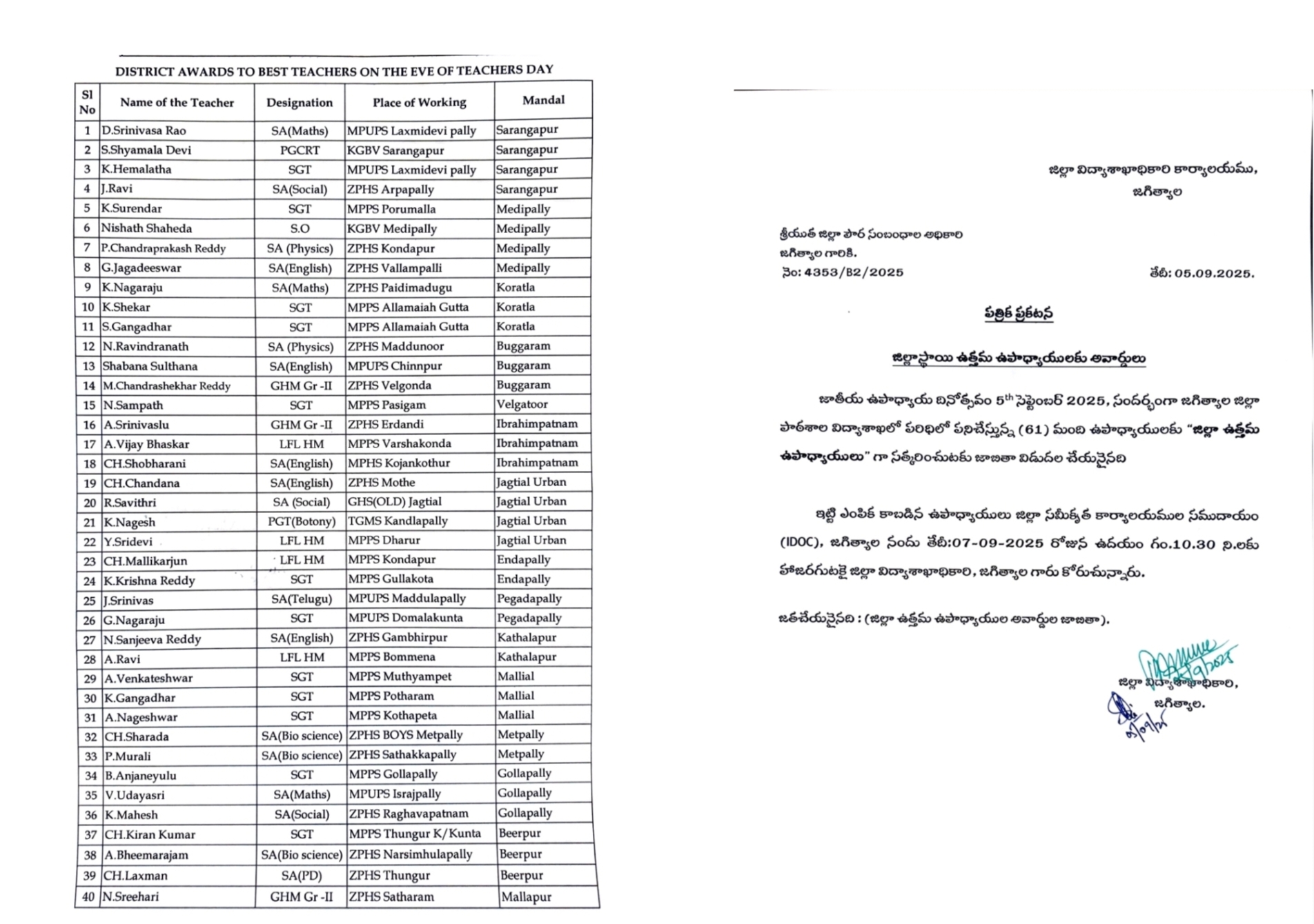 జాతీయ ఉపాధ్యాయ దినోత్సవం సందర్భంగా, 5 సెప్టెంబర్ 2025న, జగిత్యాల జిల్లా DEO రాము జిల్లాలోని పాఠశాలల్లో పనిచేస్తున్న 61 ఉత్తమ ఉపాధ్యాయుల జాబితాను ప్రకటించారు....