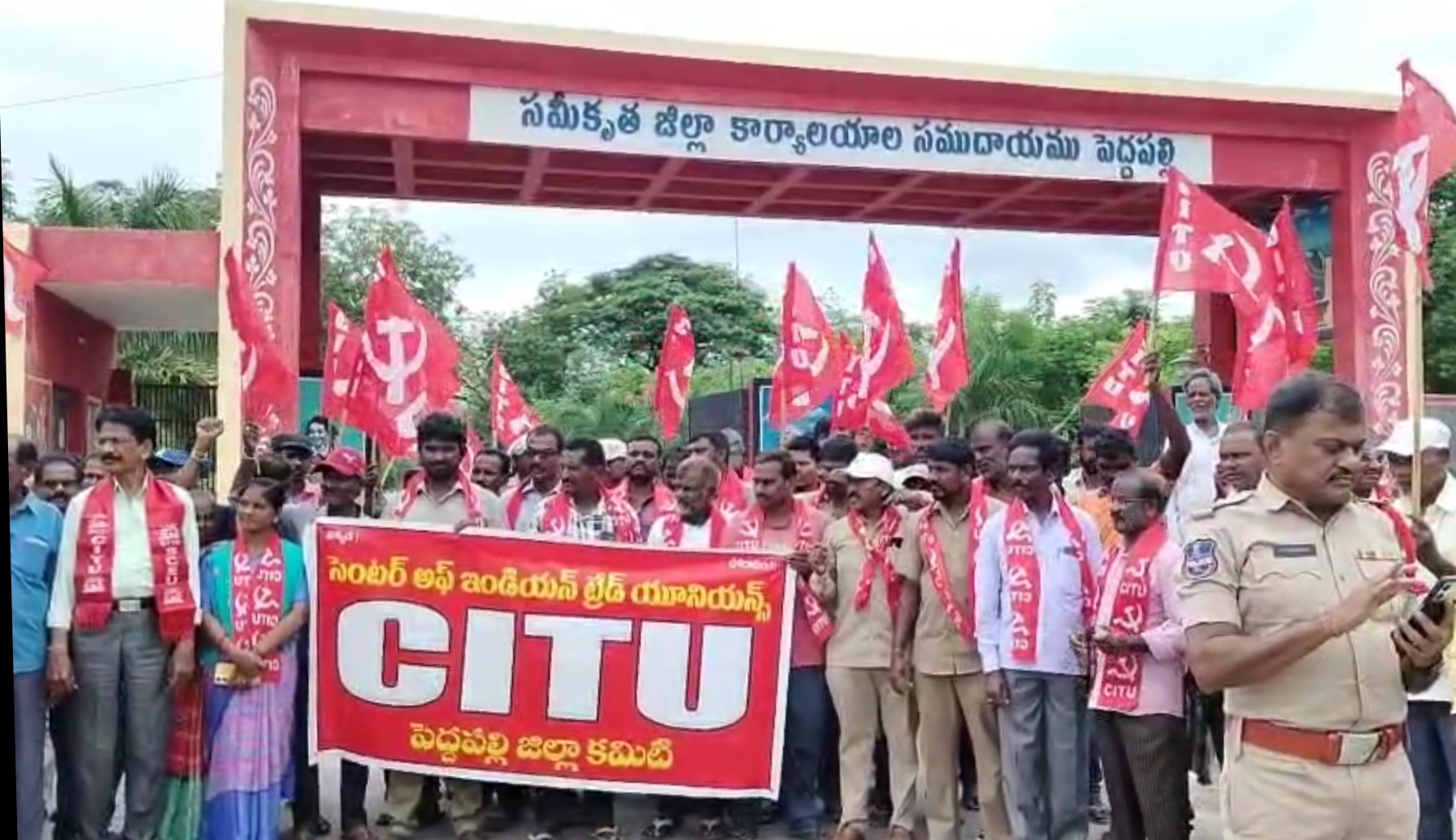 పెద్దపల్లి కలెక్టరేట్ ఎదుట సిఐటియు ఆధ్వర్యంలో కార్మికులు ఆందోళన నిర్వహించారు. కనీస వేతనాలు చెల్లించాలని, కూలీల హక్కులను కాపాడాలని వారు డిమాండ్ చేశారు. సిఐటియు నాయకులు మాట్లాడుతూ...