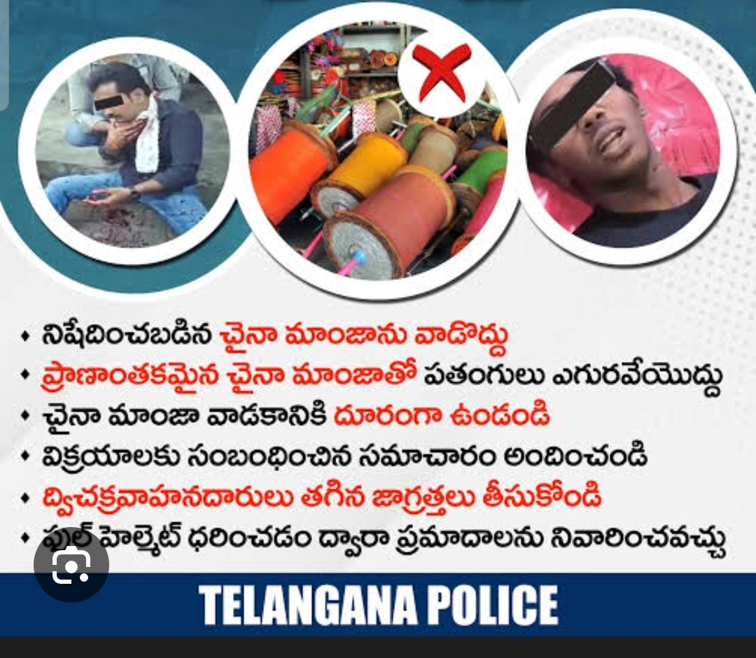 సంక్రాంతి పండుగ వేళ చైనీస్ మాంజా అమ్మకాలు, నిల్వ, రవాణా, వాడకంపై తెలంగాణ, ఆంధ్రప్రదేశ్ పోలీసులు తీవ్ర హెచ్చరికలు జారీ చేశారు. పర్యావరణ పరిరక్షణ చట్టం, 1986...