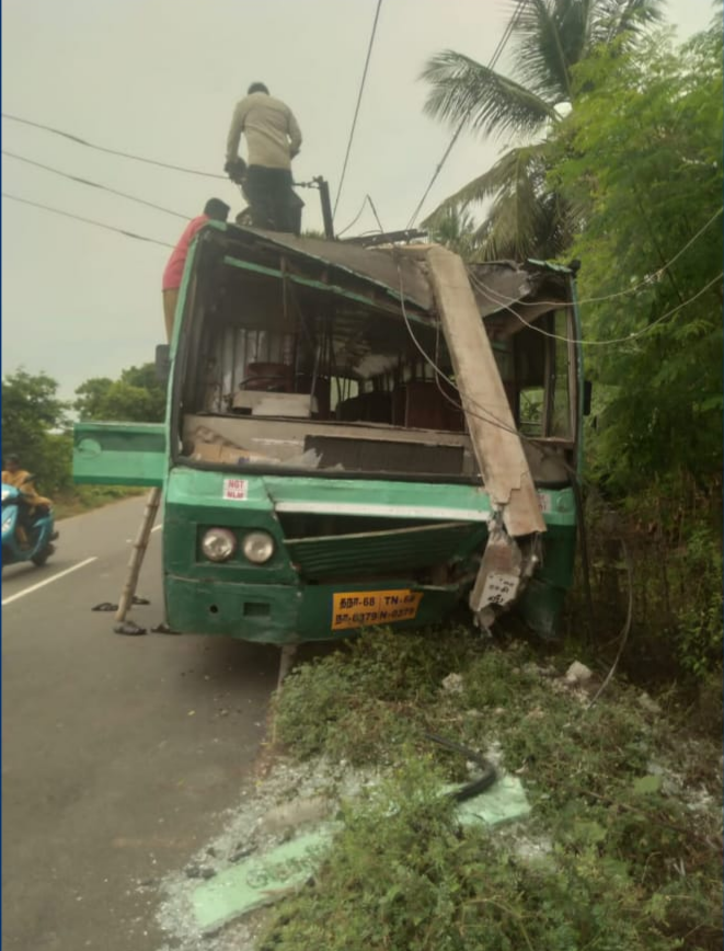 குடவாசலில் அரசு பேருந்து மின் கம்பத்தில் மீது மோதி விபத்து