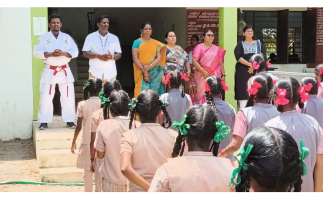 பள்ளியில் மாணவிகளுக்கு தற்காப்பு கலை பயிற்சி