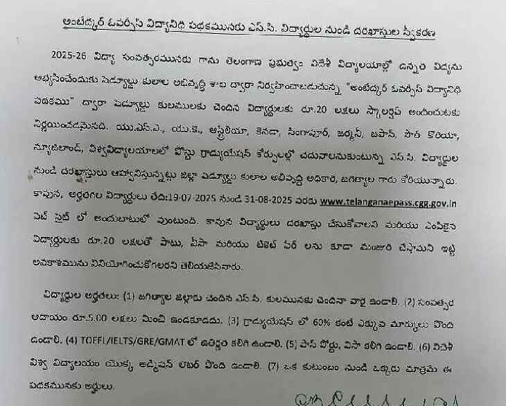 2025- 26 ఏడాదికి గాను అంబేడ్కర్ ఓవర్సీస్ విద్యానిధి పథకానికి SC విద్యార్థుల నుంచి దరఖాస్తులను ఆహ్వానిస్తున్నట్లు JGTL జిల్లా షెడ్యూల్డ్ కులాల అధికారి తెలిపారు. USA,...