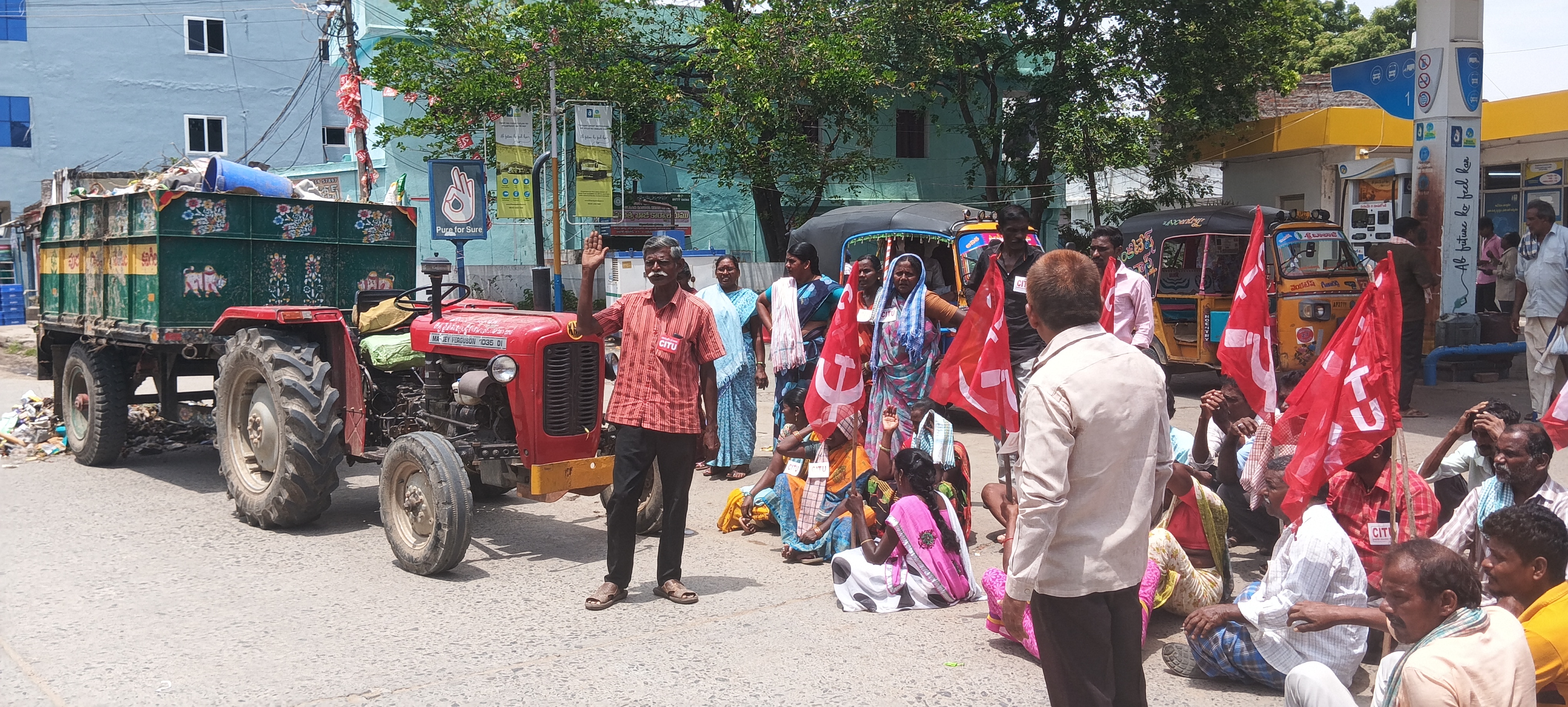 రోడ్డుపై బైఠాయించిన పారిశుద్ధ్య కార్మికులు