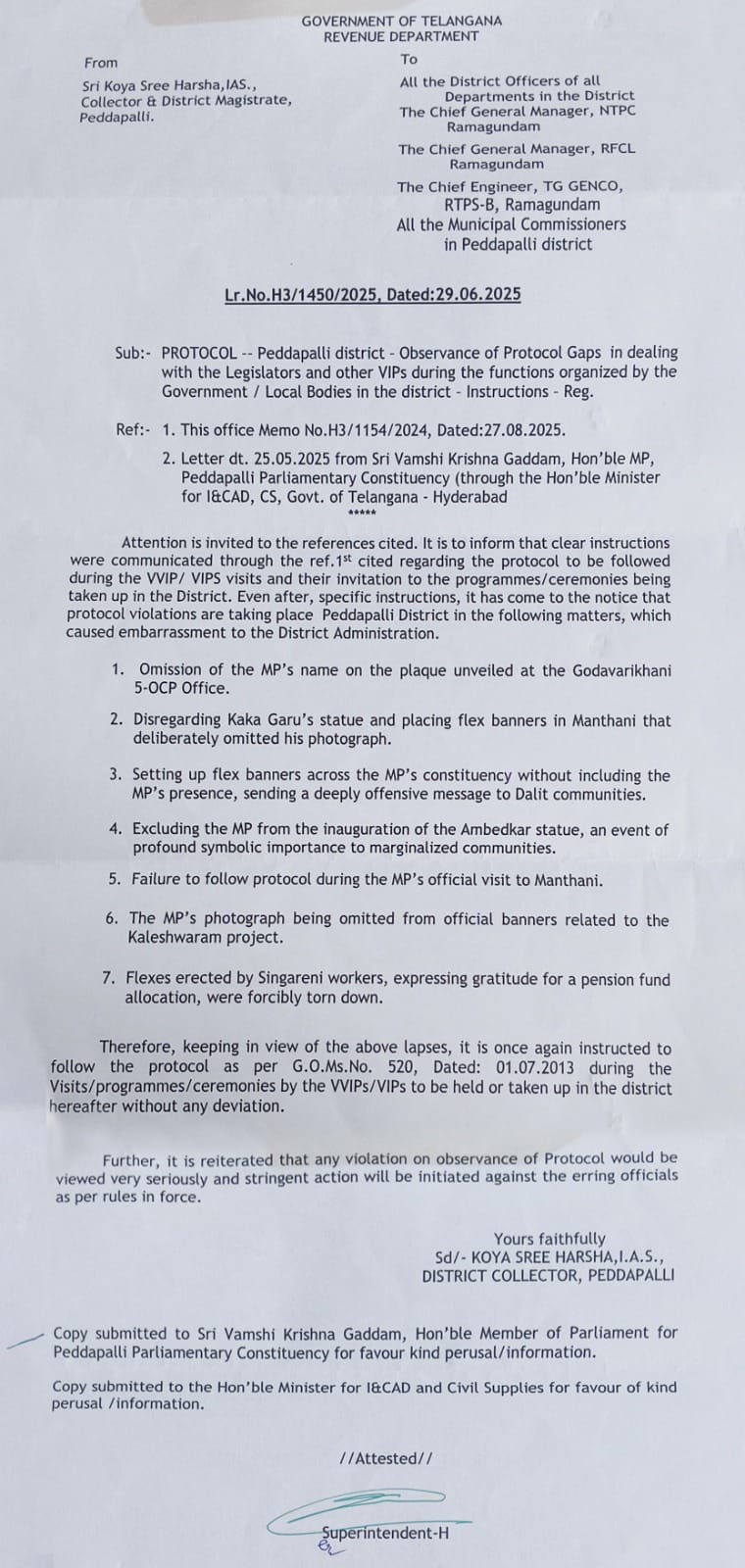 పెద్దపల్లి జిల్లాలో ప్రోటోకాల్ అమలు కాకపోవడంపై పెద్దపల్లి ఎంపీ వంశీ గడ్డం ఢిల్లీలోని చీఫ్ సెక్రటరీకి లేఖ రాయడంతో జిల్లా పరిపాలనలో వేగవంతమైన చర్యలు చేపట్టారు. ఈ...