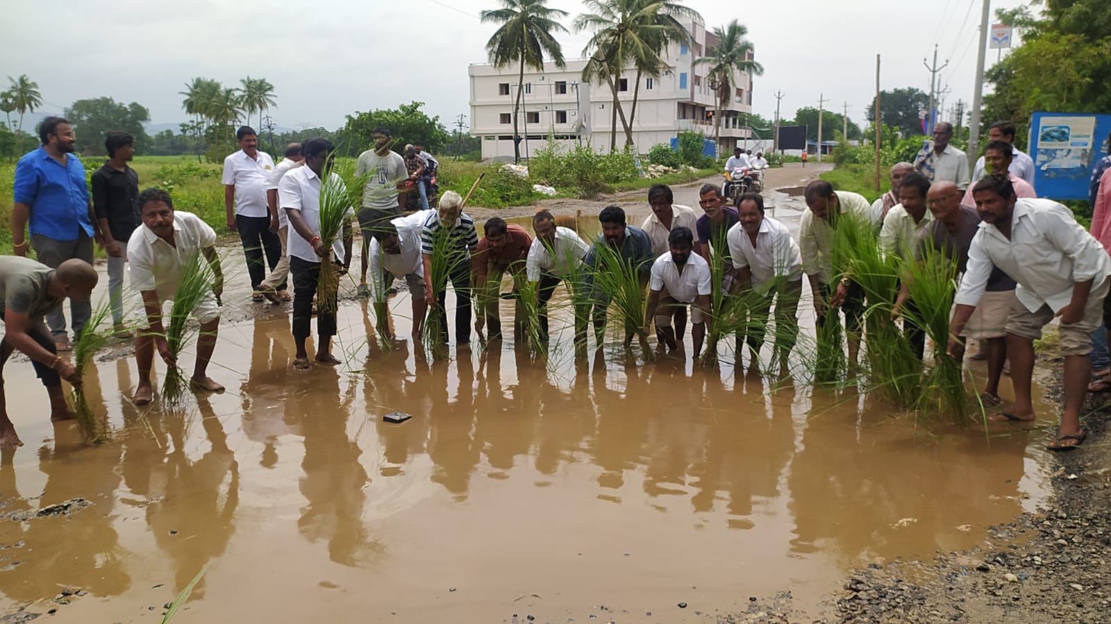నర్సీపట్నం-భీములి రహదారి దుస్థితిపై వడ్డాదిలో వైసీపీ నేతలు వినూత్న నిరసన చేపట్టారు. వైస్ ఎంపీపీ దొండా లలిత నారాయణమూర్తి ఆధ్వర్యంలో బురదమయమై రోడ్లపై మొక్కలు నాటి నిరసన...