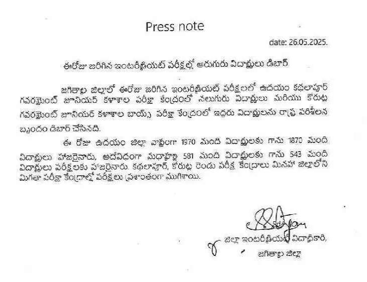 ఇంటర్ పరీక్షల్లో ఆరుగురు విద్యార్థులు డిబార్