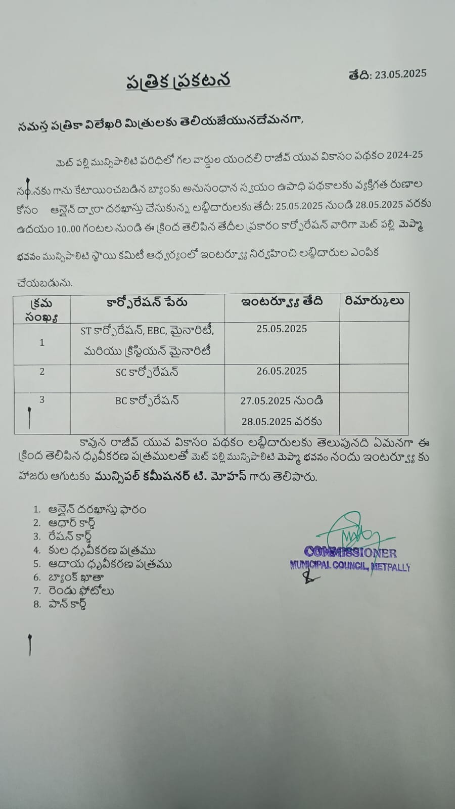 మెట్ పల్లి పట్టణ వాసులకు రాజీవ్ యువ వికాసం పథకానికి దరఖాస్తు చేసుకున్న వారు ఈనెల 25 నుంచి 28 వరకు మెట్ పల్లి మున్సిపల్ ఆఫీస్...