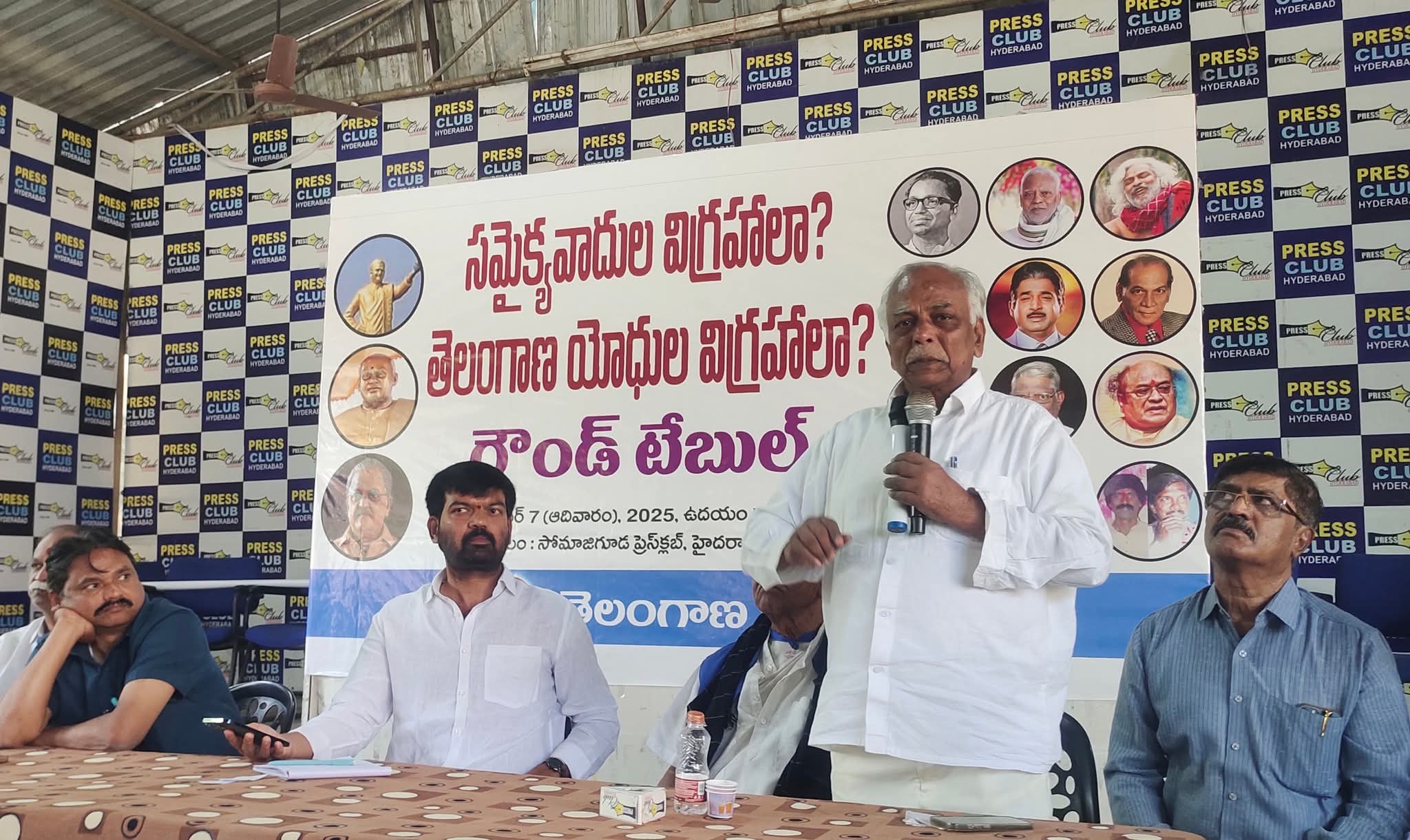 హైదరాబాద్: “సమైక్యవాదుల విగ్రహాలా? తెలం గాణ యోధుల విగ్రహాలా?” అనే ప్రధాన అంశంపై సోమాజిగూడ ప్రెస్క్లబ్లో రౌండ్ టేబుల్ సమావేశం జరిగింది. ఈ సమావేశాన్ని తెలంగాణ క్రాంతి...