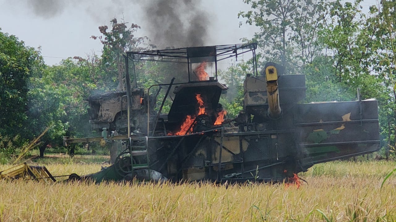 పొలంలో వరి కోస్తుండగా హార్వెస్టర్ దగ్ధం