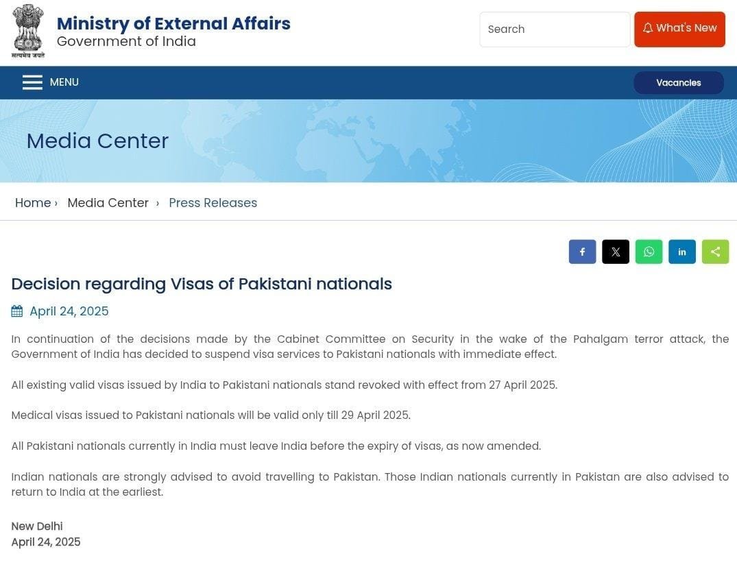 పహల్గామ్ ఉగ్రవాద దాడి నేపథ్యంలో కేంద్ర భద్రతా వ్యవహారాల కేబినెట్ కమిటీ కీలక నిర్ణయం తీసుకుంది. పాక్ పౌరులకు వీసా సేవలను నిలిపి వేసింది. ఏప్రిల్ 27...