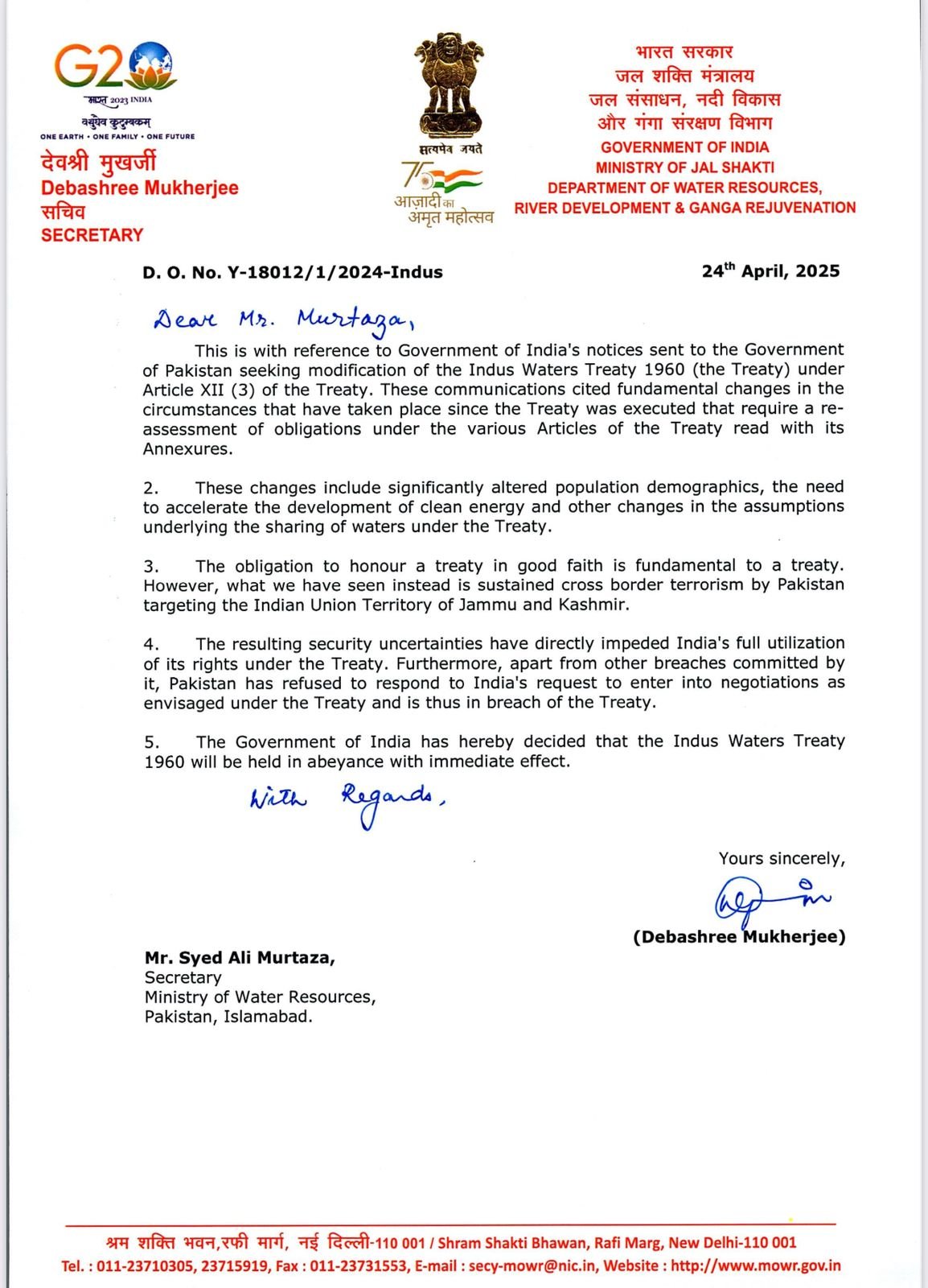 కేంద్ర ప్రభుత్వం పాకిస్తాన్ కు లేఖ రాసింది. పహల్గామ్ ఉగ్రదాడి నేపథ్యంలో సింధూ జలాల ఒప్పందాన్ని నిలిపి వేస్తున్నట్లు ప్రకటించారు పీఎం మోదీ. ఈ మేరకు లేఖ...