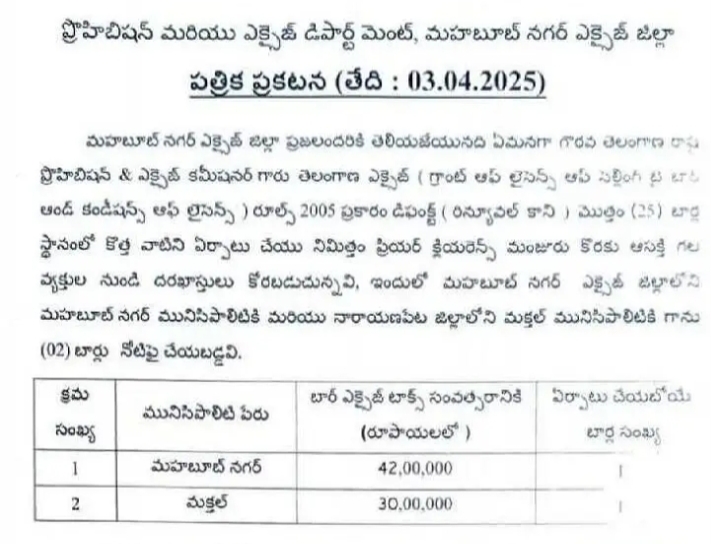 మహబూబ్ నగర్, మక్తల్ లో కొత్త బార్ల కోసం నోటిఫికేషన్