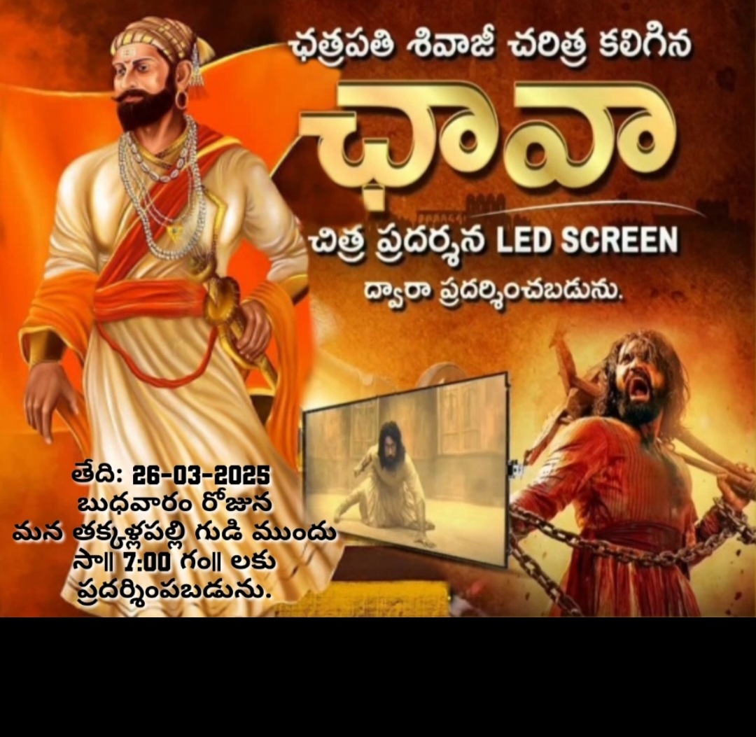 కథలాపూర్ మండల్ తక్కలపల్లి గ్రామంలో చావా చిత్రం గ్రామంలోని శ్రీ వెంకటేశ్వర దేవాలయం ముందర పెద్ద స్క్రీన్ పై ప్రదర్శించారు. గ్రామంలోని యువకులకు చత్రపతి శివాజీ మహారాజ్...