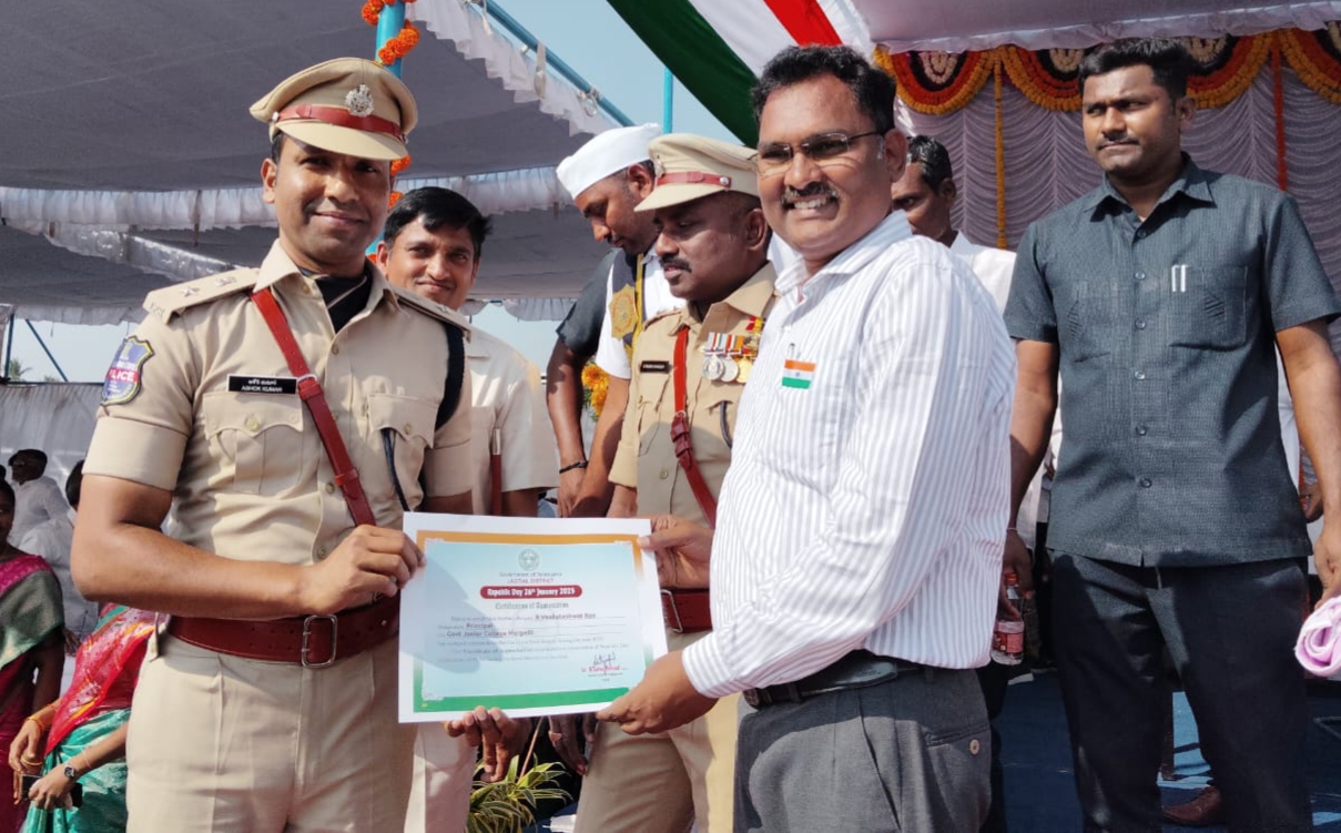 మెట్ పల్లి ప్రభుత్వ జూనియర్ కళాశాల ప్రిన్సిపల్ రావులపల్లి వెంకటేశ్వరరావుకు ప్రశంసాపత్రం లభించింది. విధులలో ఉత్తమ సేవలు అందించినందుకుగాను గణతంత్ర దినోత్సవాన్ని పురస్కరించుకొని జగిత్యాల పరేడ్ గ్రౌండ్లో...