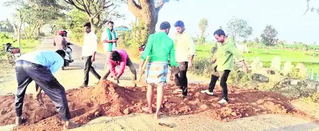 రోడ్డుపై గుంతల పూడ్చివేత