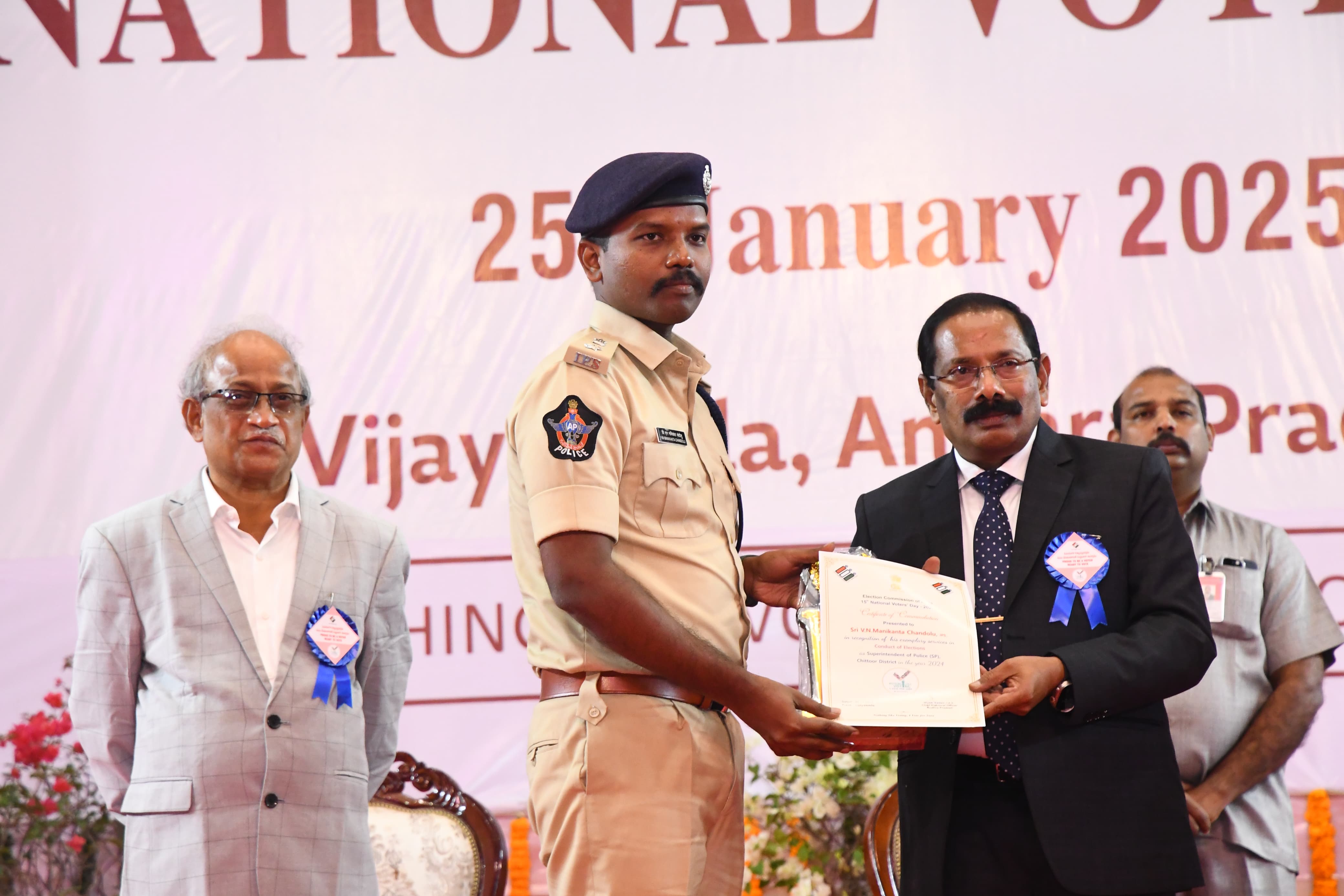 2024వ సంవత్సరంలో ఎన్నికలను సమర్ధవంతంగా నిర్వహించినందుకు గాను “ఉత్తమ ఎన్నికల నిర్వహణ పురస్కారం” అందుకున్నారు చిత్తూరు జిల్లా ఎస్పీ వి.ఎన్. మణికంఠ చందోలు.15వ జాతీయ ఓటర్ల దినోత్సవం...