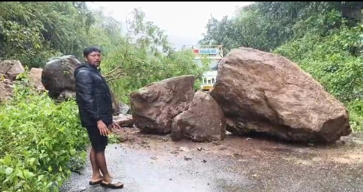 రోడ్డుపై విరిగిపడ్డ కొండచరియలు