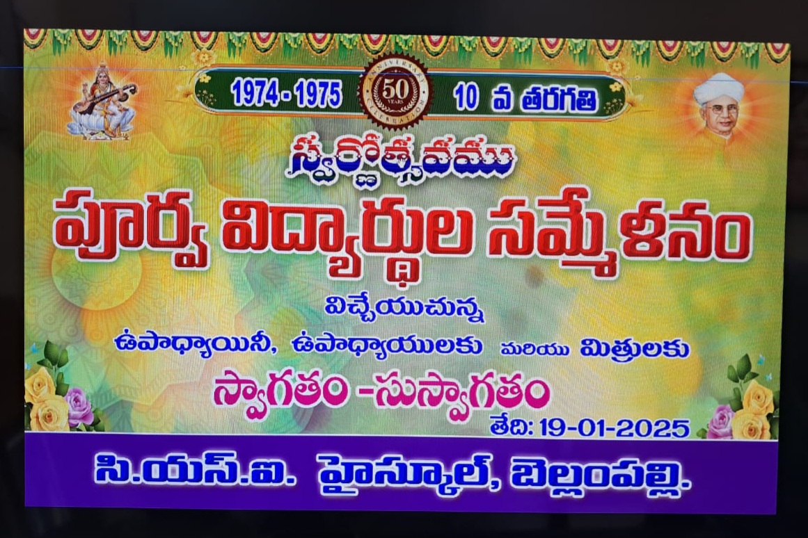బెల్లంపల్లి సిఎస్ఐ ఉన్నత పాఠశాలలో ఆదివారం 1974-75 సంవత్సరంలో పదోవతరగతి చదివిన చిన్ననాటి మిత్రులు 50ఏళ్ల తరువాత కలుసుకొనున్నారు. వివిధ వృత్తులలో ప్రభుత్వ, ప్రైవేటు ఉద్యోగాలలో, వివిధ...