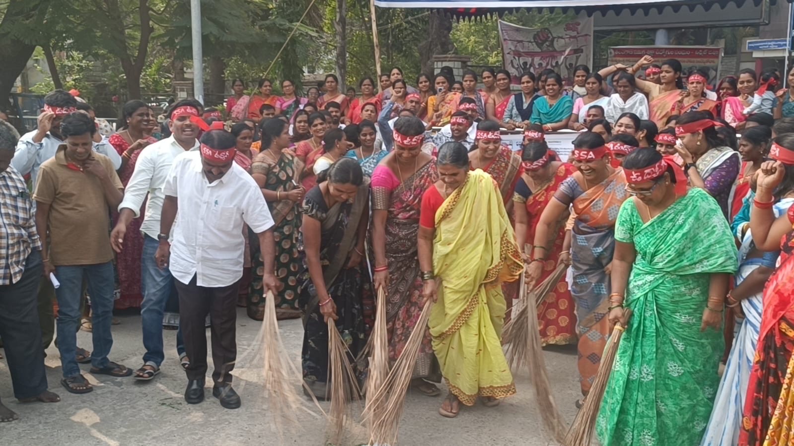 రోడ్లు ఊడుస్తూ ఎస్ఎస్ఏ ఉద్యోగుల నిరసన