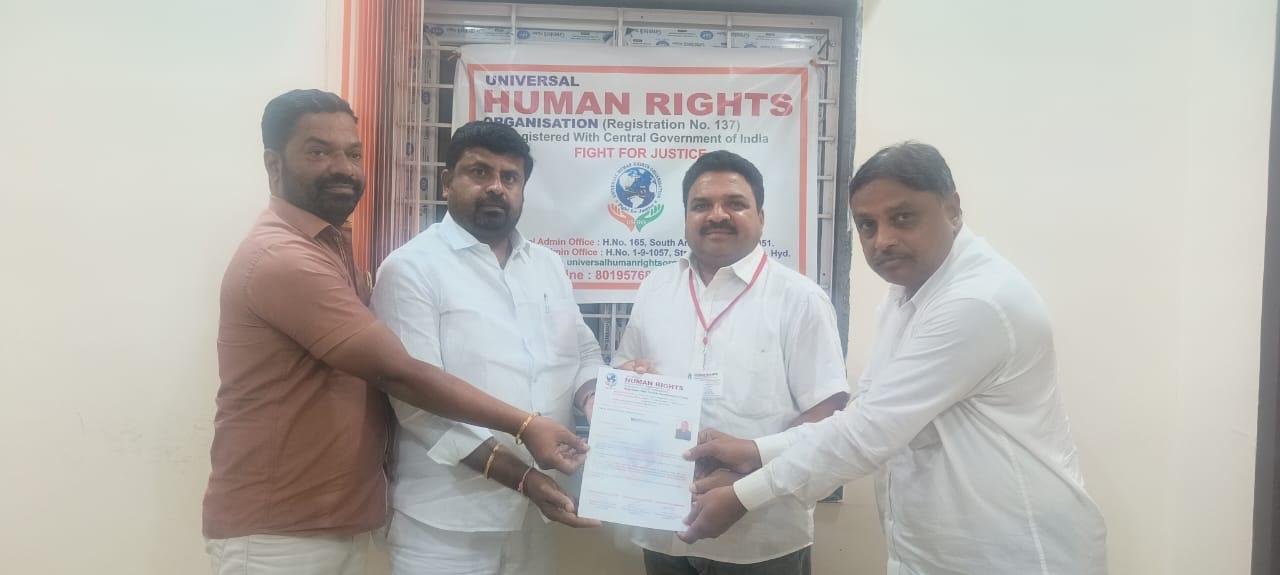 యూనివర్సల్ హ్యూమన్ రైట్స్ ఆర్గనైజేషన్ జగిత్యాల జిల్లా అధ్యక్షుడిగా మెట్పల్లి పట్టణానికి చెందిన గుంటుక అనిల్ కుమార్ నియమించబడ్డారు. ఈ కార్యక్రమంలో యూనివర్సల్ హ్యూమన్ రైట్స్ ఆర్గనైజేషన్...