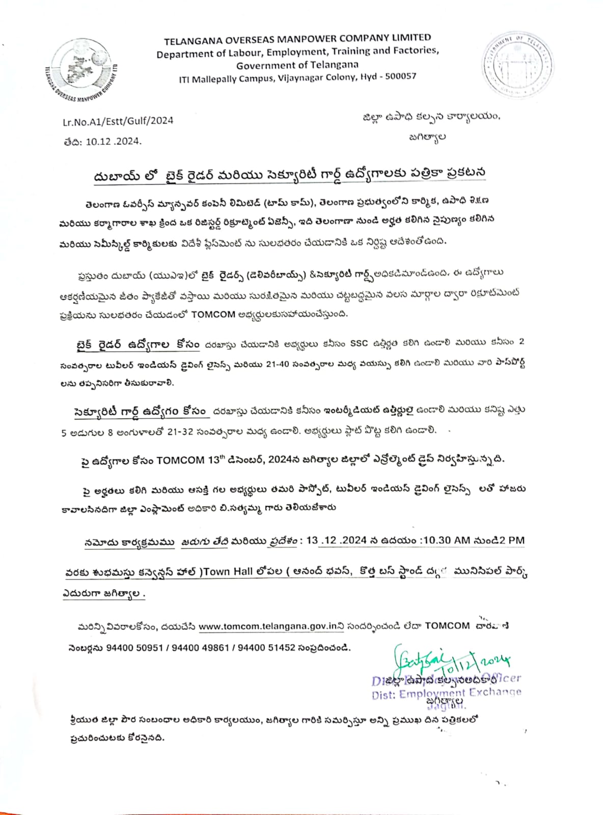 తెలంగాణ ప్రభుత్వంలోని కార్మిక, ఉపాధి శిక్షణ, కర్మాగారాల శాఖ కింద ఒక రిజిస్టర్డ్ రిక్రూట్మెంట్ ఏజెన్సీ ద్వారా తెలంగాణా నుండి అర్హత కలిగిన నైపుణ్యం, సెమీ స్కిల్డ్...