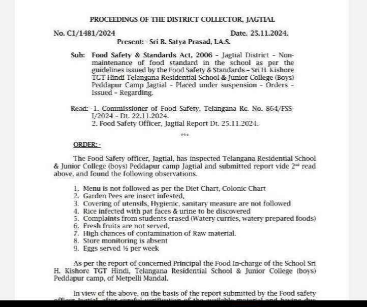 పెద్దాపూర్ గురుకుల పాఠశాల ఫుడ్ ఇంఛార్జి సస్పెండ్