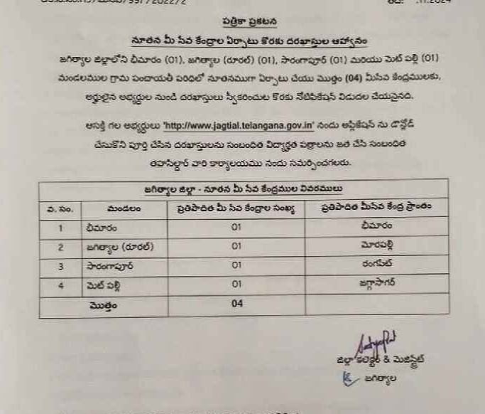 భీమారం మండల కేంద్రంలో, జగిత్యాల రూరల్ మండలం మోరపల్లి గ్రామంలో, సారంగపూర్ మండలం రంగపేట్ గ్రామంలో, మెట్పల్లి మండలం జగ్గాసాగర్ గ్రామంలో మీసేవా కేంద్రాల ఏర్పాటుకు దరఖాస్తులను...