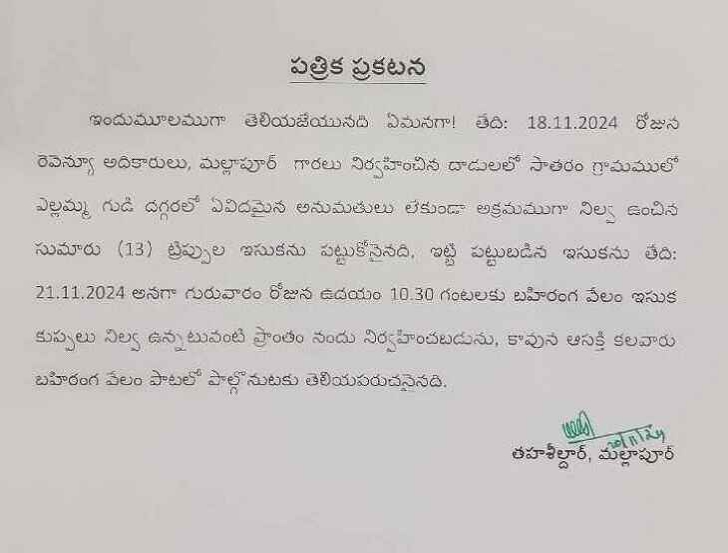 మల్లాపూర్ మండల పరిధిలో ఇటీవల రెవెన్యూ అధికారులు, పోలీసు అధికారులు పట్టుకున్న ఇసుక డంపులకు బహిరంగ వేలం నిర్వహిస్తున్నట్లుగా తహసీల్దార్ ఎల్.వీర్ సింగ్ నాయక్ తెలిపారు. ఈనెల...