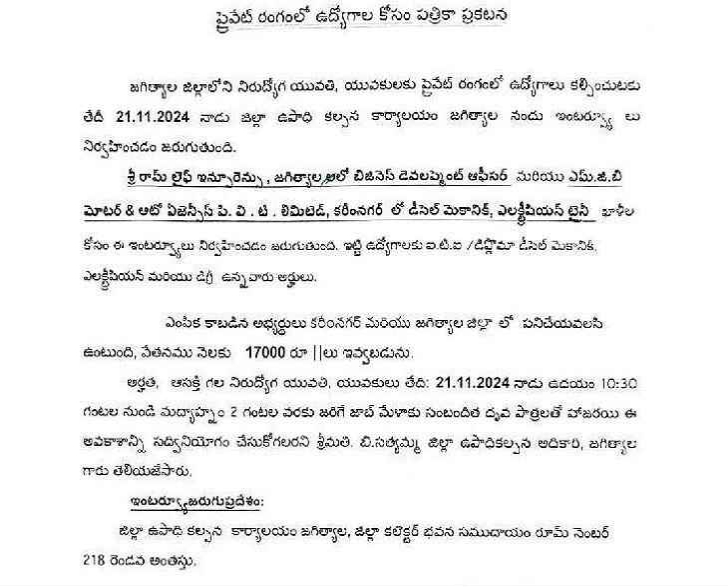 జగిత్యాల జిల్లాలోని నిరుద్యోగులకు ప్రైవేట్ రంగంలో ఉద్యోగాలు కల్పించేందుకు ఈనెల 21న జిల్లా ఉపాధి కల్పన కార్యాలయంలో ఇంటర్వ్యూలు నిర్వహిస్తున్నట్లు జిల్లా ఉపాధి కల్పన అధికారి సత్యమ్మ...