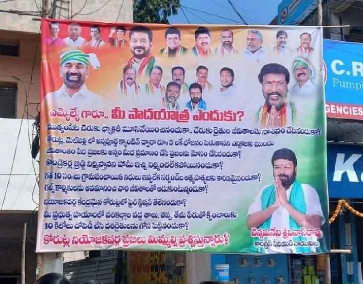 కోరుట్ల ఎమ్మెల్యే గారు మీ పాదయాత్ర ఎందుకు? అంటూ కాంగ్రెస్ నాయకుడు చెన్నమనేని శ్రీనివాసరావు ఎమ్మెల్యే కల్వకుంట్ల సంజయ్ని ఉద్దేశించి కోరుట్ల పట్టణంలో ఫ్లెక్సీని ఏర్పాటు చేశారు....