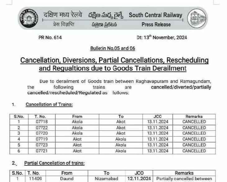 గూడ్స్ రైలు ప్రమాదం నేపథ్యంలో రైల్వే శాఖ పలు రైళ్లను రద్దు చేయగా.. మరికొన్నింటిని దారి మళ్లించింది. రాఘవాపూర్ రామగుండం మధ్య గూడ్స్ రైలు పట్టాలు తప్పింది....