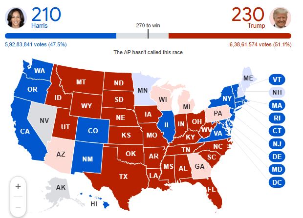అమెరికా అధ్యక్ష ఎన్నికల్లో రిపబ్లికన్ పార్టీ అభ్యర్థి డోనాల్డ్ ట్రంప్ గెలిశారు. అమెరికాకు 47వ అధ్యక్షుడిగా రెండో సారి అధ్యక్ష పీఠం ఎక్కనున్నాడు. ట్రంప్ 277...