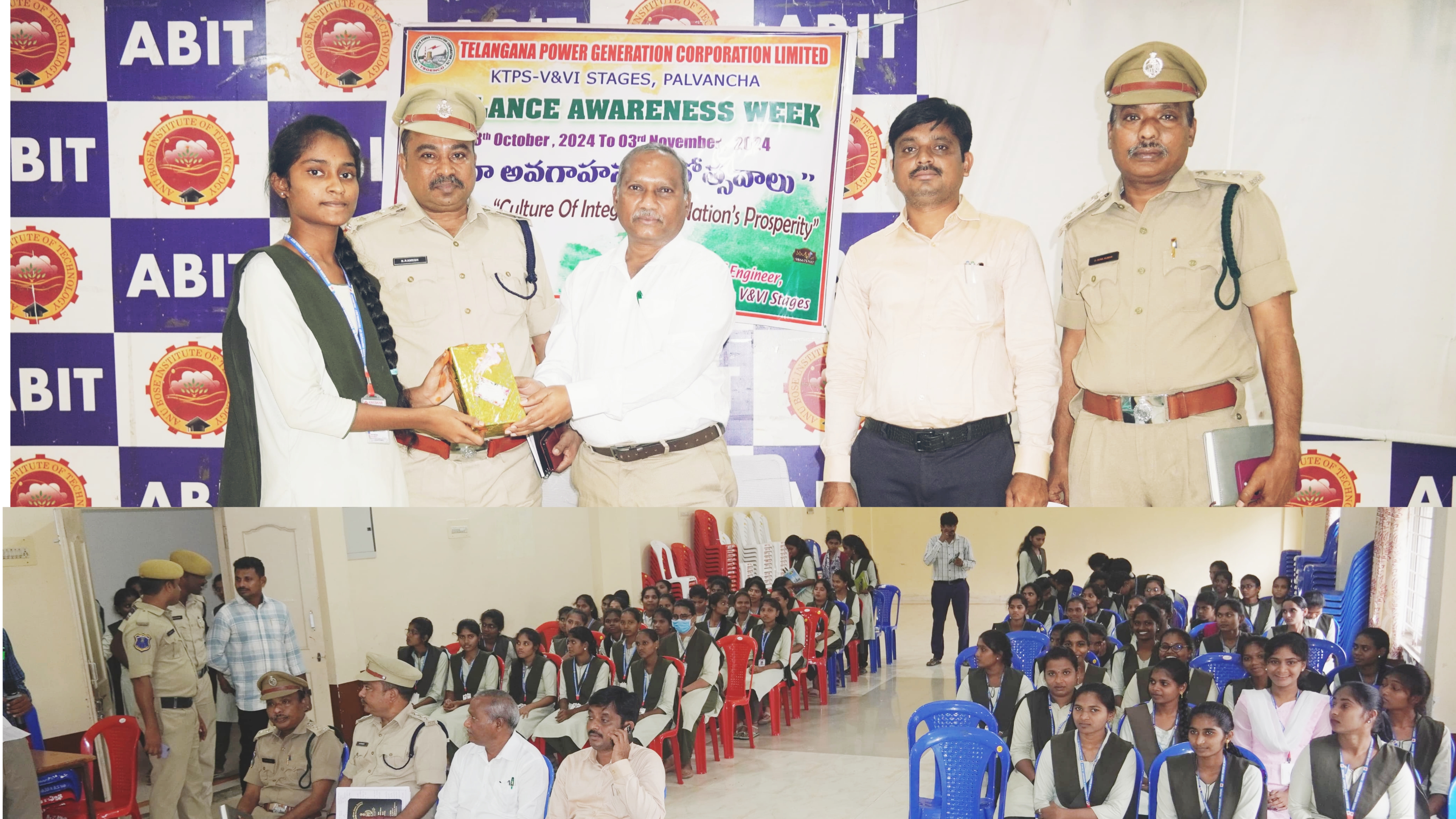 పాల్వంచ అనుబోస్ ఇంజనీరింగ్ మహిళా కళాశాలలో విజిలెన్స్ అవగాహనపై ఇంజనీరింగ్ విద్యార్థులకు "జాతీయ అభివృద్ధికి అవినీతి రహిత సమాజం పాత్ర" అనే అంశంపై కెటిపిఎస్ సిఈ ఎన్...