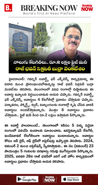 గవర్నర్ అవార్డ్స్ ఫర్ ఎక్స్లెన్స్ కార్యక్రమాన్ని ఈ ఏడాది నుంచి ప్రారంభించబోతున్నట్లు రాజ్ భవన్ సెక్రటరీ బుర్రా వెంకటేశం తెలిపారు.