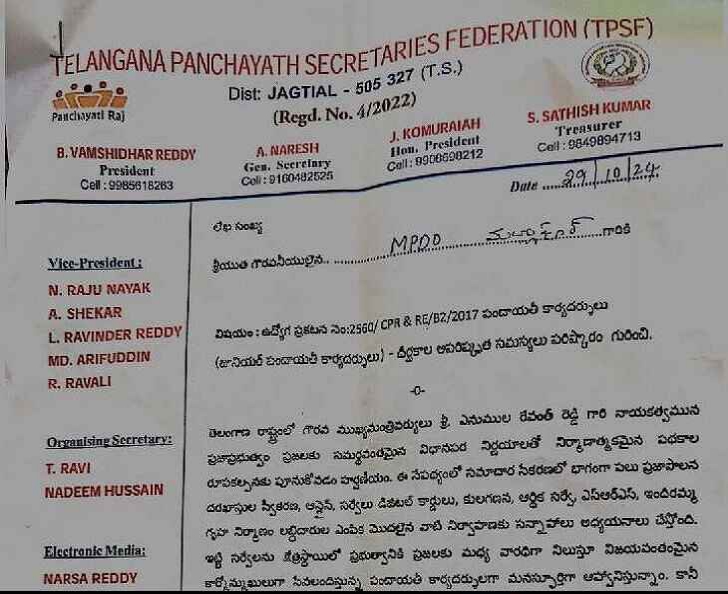 మల్లాపూర్ మండలంలోని తెలంగాణ పంచాయతీ సెక్రెటరీ ఫెడరేషన్ ఆధ్వర్యంలో ఎంపీడీవోకు వినతి పత్రాన్ని అందించారు. ఈ సందర్భంగా వారు మాట్లాడుతూ, దీర్ఘకాలంగా ఉన్న అపరిష్కృతంగా ఉన్న పంచాయతీ...