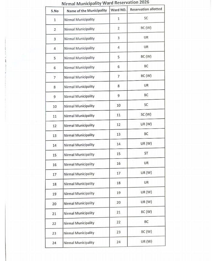 నిర్మల్ జిల్లా: మున్సిపల్ ఎన్నికల నేపథ్యంలో పట్టణంలోని మొత్తం 42 వార్డుల రిజర్వేషన్లను అధికారులు ఖరారు చేశారు. 50 శాతం వార్డులను మహిళలకు కేటాయిస్తూ ఎస్సీ, ఎస్టీ,...