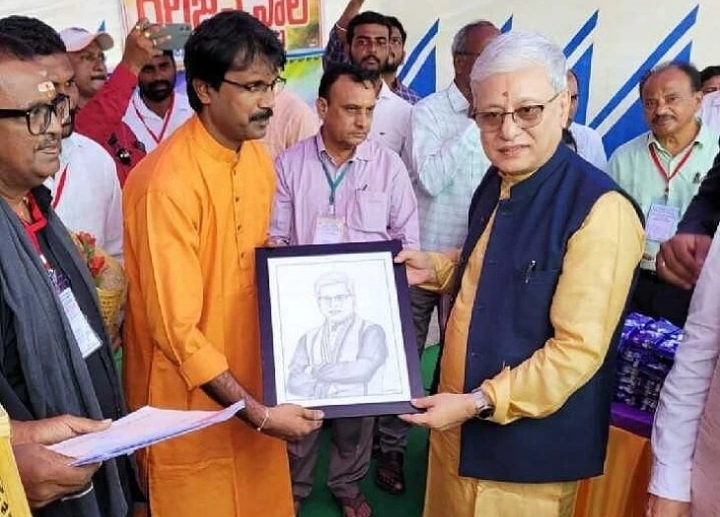 భద్రాద్రి కొత్తగూడెం జిల్లా పర్యటనలో భాగంగా కలెక్టర్ కార్యాలయానికి వచ్చిన గవర్నర్ జిష్ణు దేవ్ వర్మను కవి, చిత్రకారుడు రాజేష్ కలిసి ఆయన గీసిన గవర్నర్ బొమ్మను...