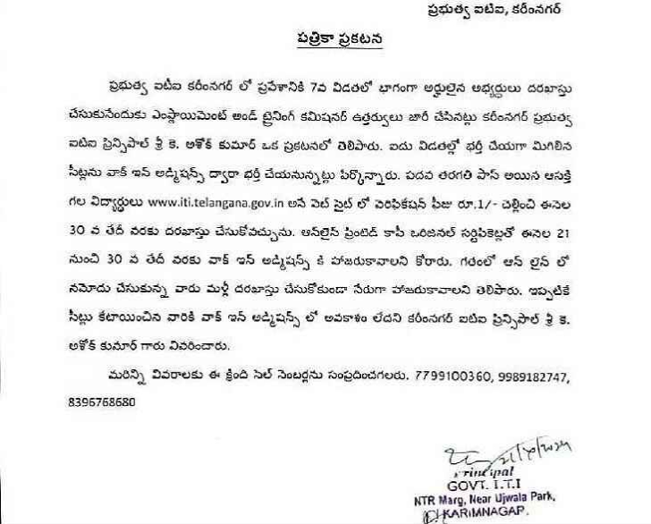 కరీంనగర్ లోని ఉజ్వల పార్కు సమీపంలో గల ప్రభుత్వ ఐటీఐ కళాశాలలో 7వ విడత అర్హులైన అభ్యర్థుల నుంచి ఐటీఐ కోర్సులో ప్రవేశానికి దరఖాస్తులు ఆహ్వానిస్తోంది. 10వ...