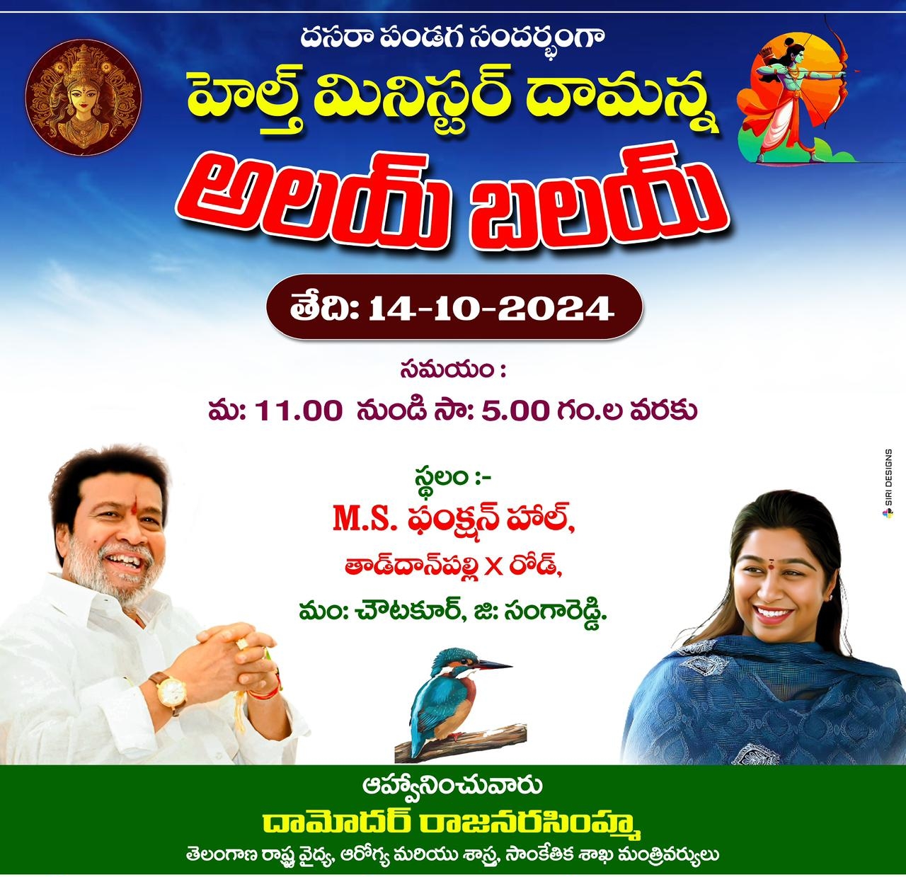 అందోల్ నియోజకవర్గం దసరా పండుగ సందర్భంగా మంత్రి దామోదర్ రాజనర్సింహ ఆధ్వర్యంలో అందోల్ నియోజకవర్గం అలయ్ బలయ్ కార్యక్రమం ఘనంగా జరుగుతోంది. సంగారెడ్డి జిల్లా చౌటాపూర్ మండలం...