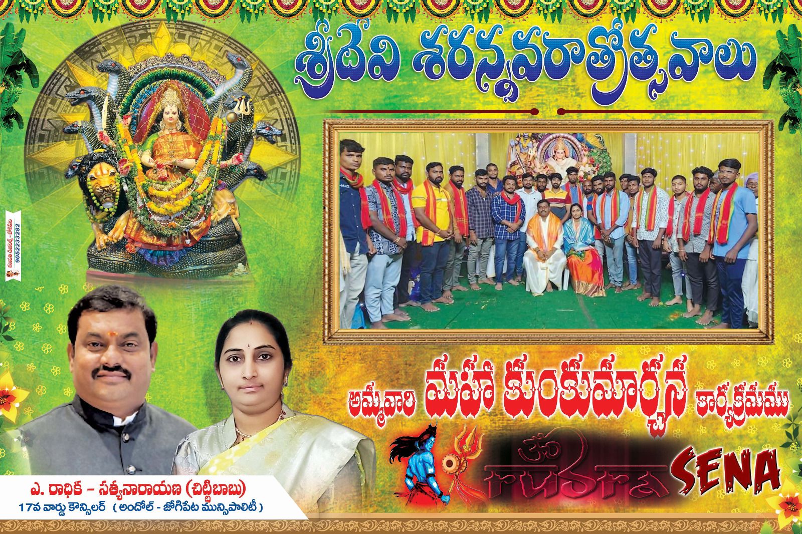 జోగిపేట పట్టణంలో రుద్ర సేన యూత్ ఆధ్వరంలో ఏర్పాటు చేసిన శ్రీదేవి శరన్ననవరాత్రోత్సవాలు ఘనంగా జరుగుతున్నాయి. ఈ సందర్భంగా శుక్రవారం సాయంత్రం జోగిపేట 17వ వార్డు కౌన్సిలర్...