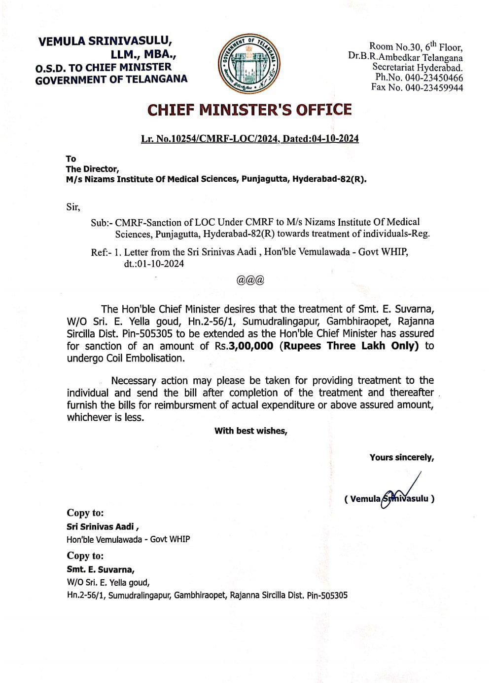 LOC మంజూరు చేయించిన ప్రభుత్వ విప్