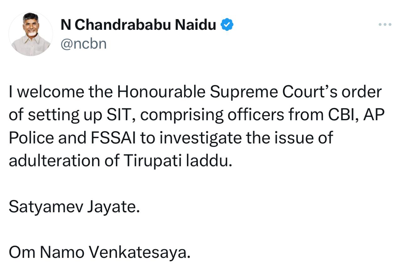 తిరుమలలో లడ్డూ కల్తీ వ్యవహారంపై స్వతంత్ర సిట్తో దర్యాప్తు జరపాలని సుప్రీంకోర్టు ఇచ్చిన ఆదేశాలను సీఎం చంద్రబాబు స్వాగతించారు. CBI, ఏపీ పోలీస్, FSSAI సభ్యులతో...