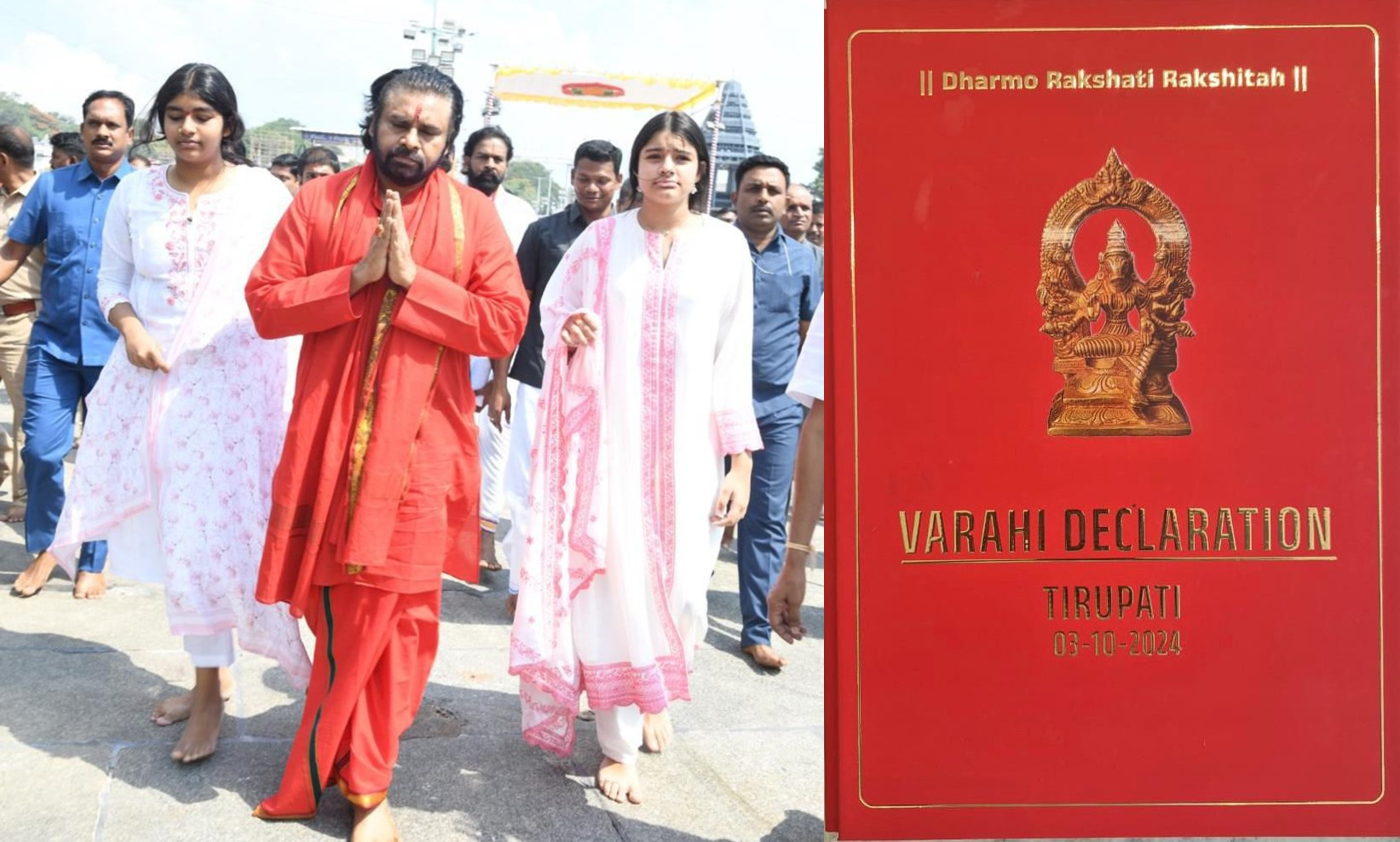 డిప్యూటీ సీఎం, జనసేన అధ్యక్షుడు పవన్ కళ్యాణ్ తన కుమార్తెలతో కలిసి తిరుమల శ్రీవారిని దర్శించుకున్నారు. ఈ సందర్భంగా పవన్ వారాహి డిక్లరేషన్ పుస్తకాన్ని వెంట తీసుకువెళ్లారు....