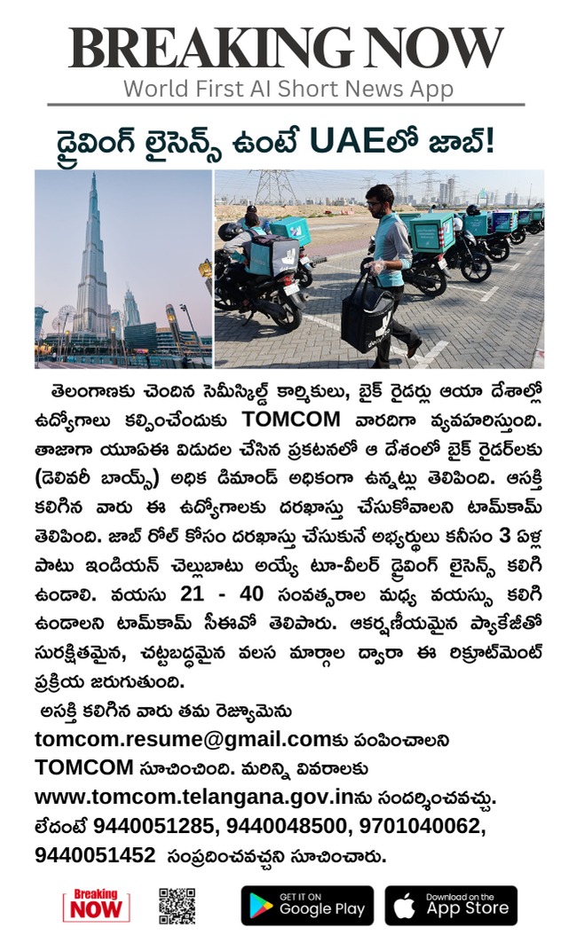 జగిత్యాల: దుబాయిలో డెలివరీ బాయ్స్ ఉద్యోగాల కోసం టామ్ కం వారి ఆధ్వర్యంలో జగిత్యాల జిల్లాలో ఈనెల 5న ఇంటర్వ్యూలు నిర్వహిస్తున్నట్లు జిల్లా ఉపాధి కల్పన అధికారి...