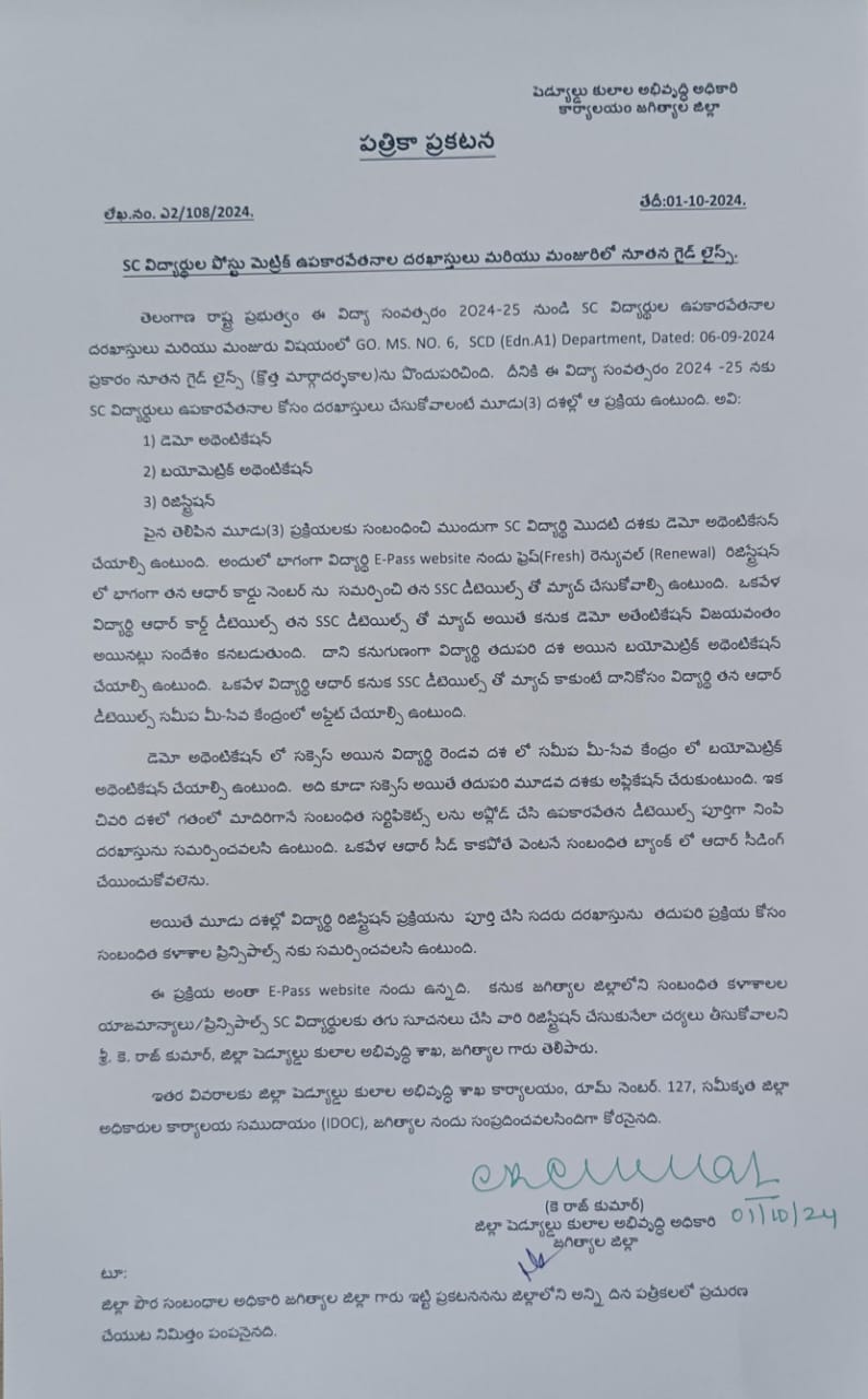 జగిత్యాల: తెలంగాణ రాష్ట్ర ప్రభుత్వం ఈ విద్యా సంవత్సరం నుండి ఎస్సీ విద్యార్థుల ఉపకార వేతనాల మంజూరుకు నూతన గైడ్ లైన్స్ ను రూపొందించిందని జిల్లా షెడ్యూల్...
