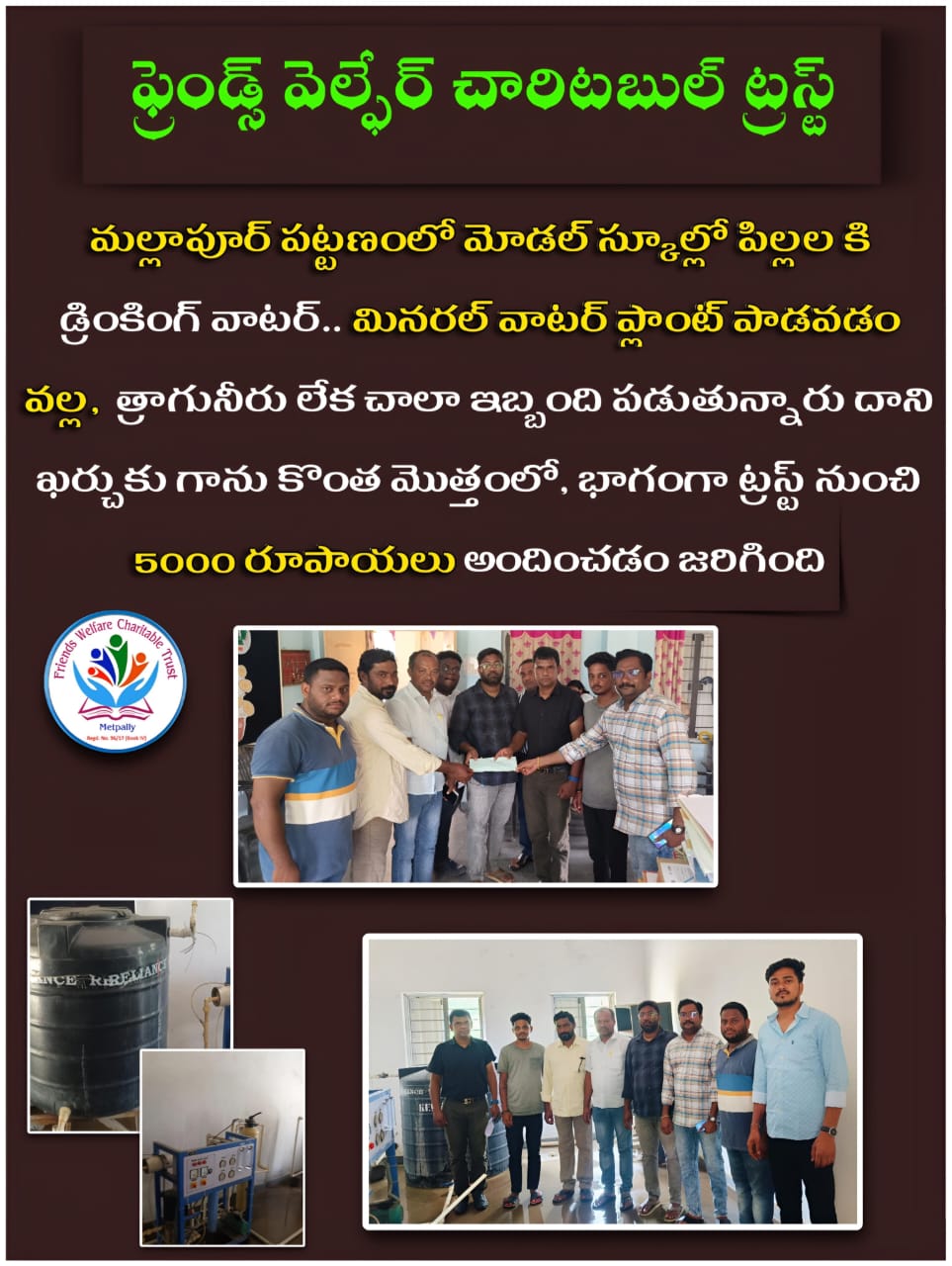 మల్లాపూర్ మండలంలోని మోడల్ స్కూల్లో తాగు నీటి శుద్ధి యంత్రం చెడి పోవడం జరిగి విద్యార్థులు తాగు నీరు కొరకు ఇబ్బంది పడటంతో విషయం తెలుసుకుంది మెట్పల్లి...