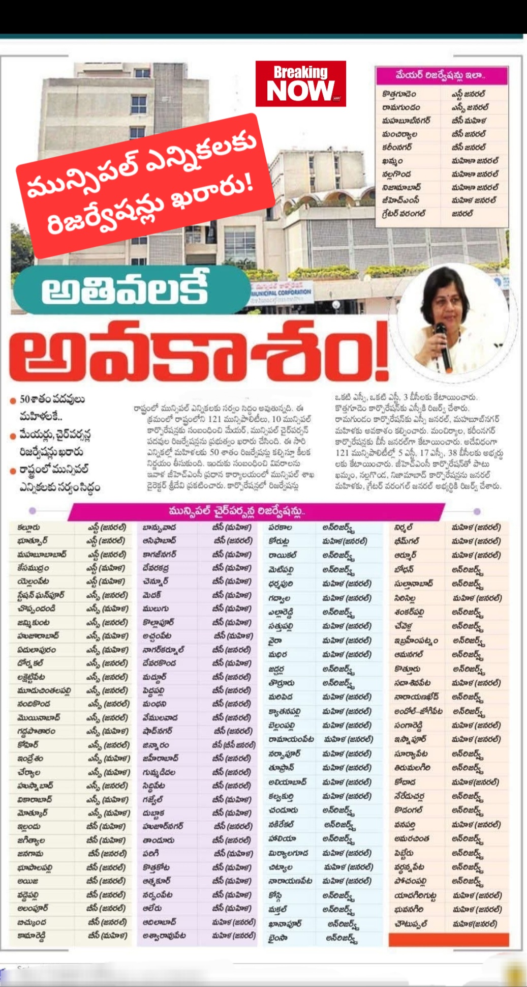 తెలంగాణలో కార్పొరేషన్ మేయర్లు, మున్సిపల్ ఛైర్పర్సన్ల రిజర్వేషన్లు ఖరారు