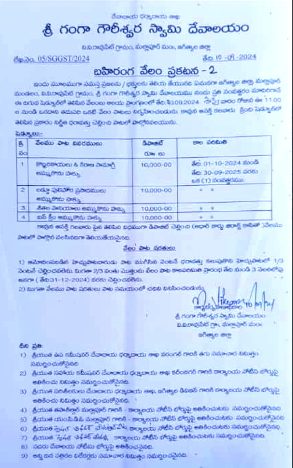 జగిత్యాల జిల్లా మల్లాపూర్ మండలం, వివి రావుపేట్ గ్రామంలోని శ్రీ గంగా గౌరీశ్వర స్వామి దేవాలయ వద్ద కొబ్బరికాయలు, ప్రసాదాలు, సీతలపానీయాలు వంటి వాటికి టెండర్ నిర్వహించనున్నారు....